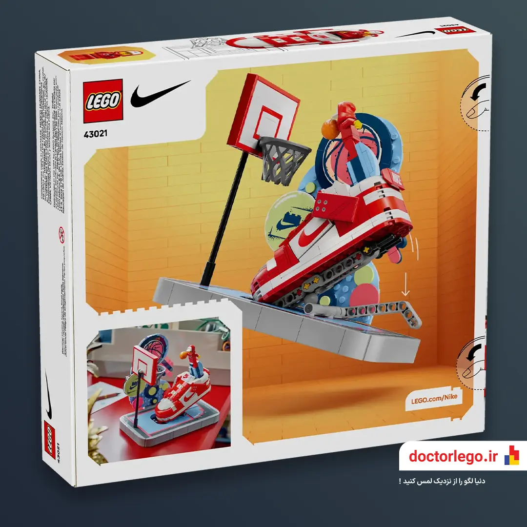 این ست خاص از همکاری رسمی نایکی و لگو ساخته شده و شامل ۲۳۰ قطعه رنگی، خوشفرم و هوشمندانهست. بند کفش واقعی داره، زبان کفش بلند طراحی شده، تابلوی بسکت هم همراهشه، و همه چیز روی یه استند مخصوص نصب میشه تا حس لحظه پرش رو کاملاً منتقل کنه.