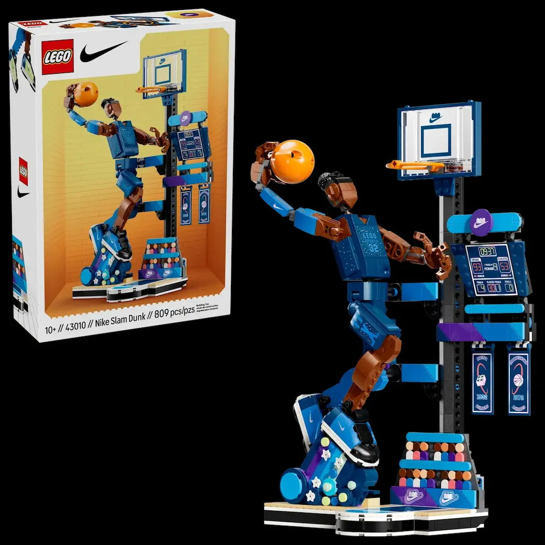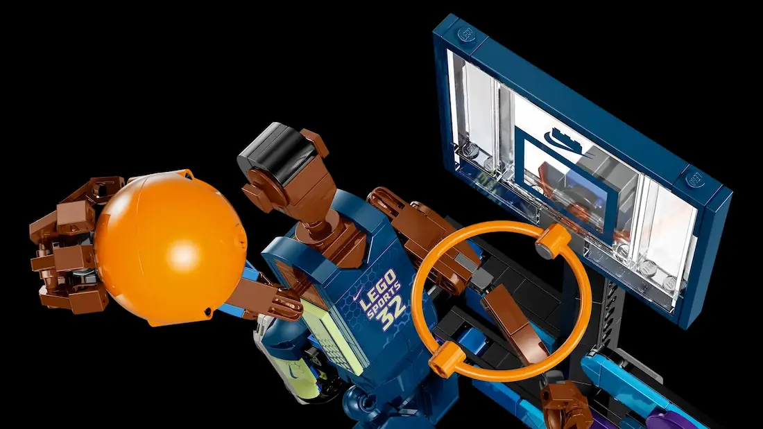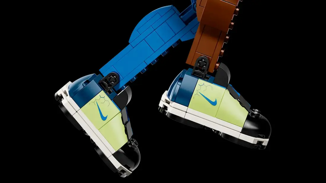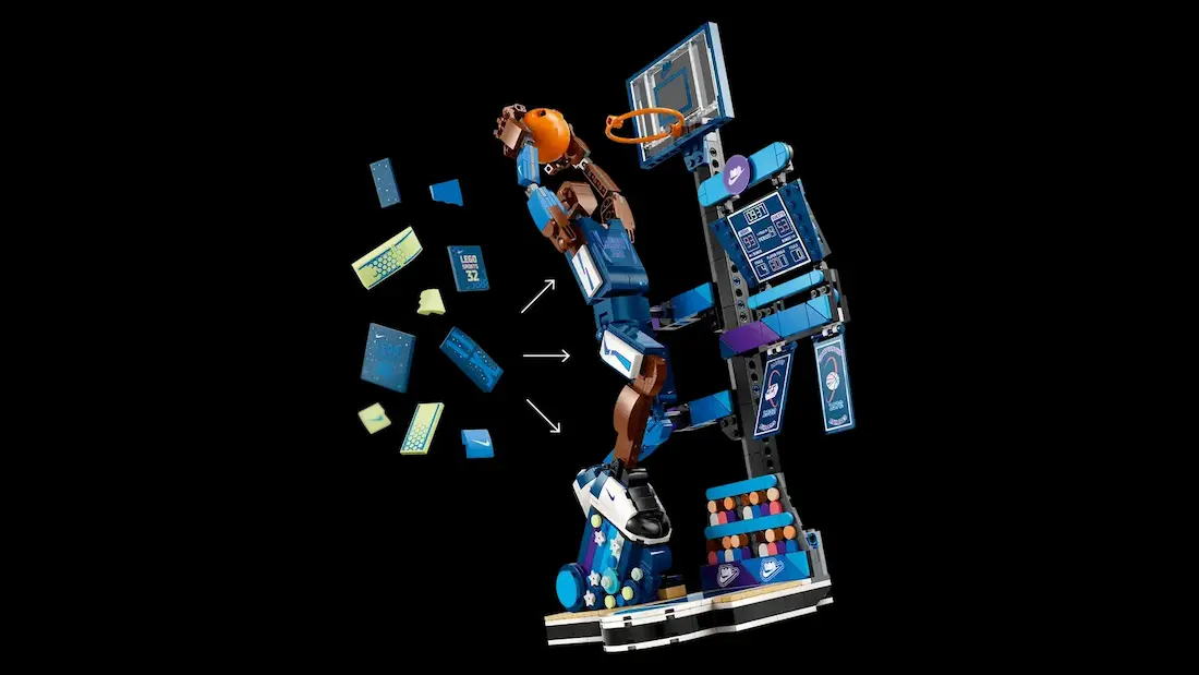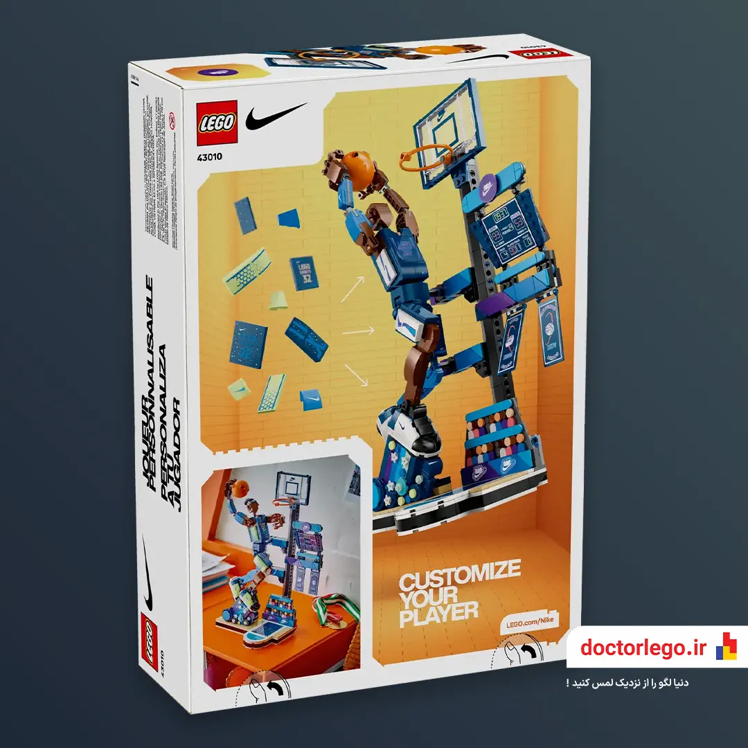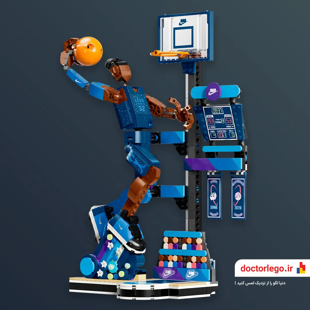 حتی پایهی مخصوص اسلمدانک همراهشه – یه نیمحلقهی لِگویی با مینیبسکت، تا وقتی کفش رو به نمایش میذاری، حس حرکت، پرش، و ضربهی نهایی توپ توی ذهن بمونه. انگار خودت تو اون لحظه بودی.