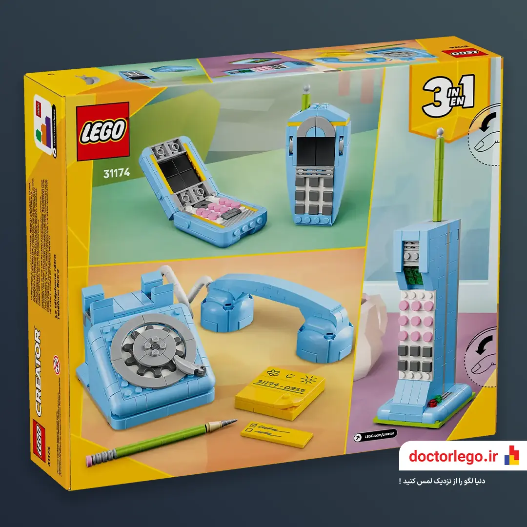 نکته‌ی جالب‌تر اینجاست که Retro Telephone 31174 فقط یه مدل نیست. چون مثل همه‌ی ست‌های 3-in-1 LEGO Creator می‌تونی این تلفن رو تبدیلش کنی به یه تلویزیون رومیزی قدیمی یا یه ماشین تایپ کلاسیک! این یعنی با یه جعبه لگو، سه‌تا تجربه‌ی نوستالژیک و جذاب در اختیارته، و هر بار یه دنیای متفاوت رو می‌سازی.