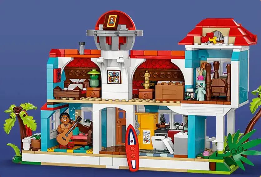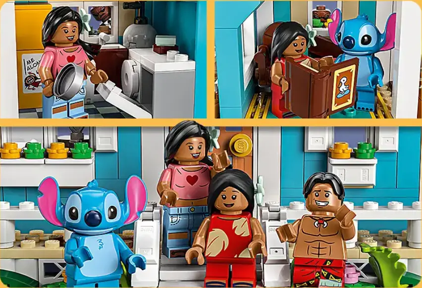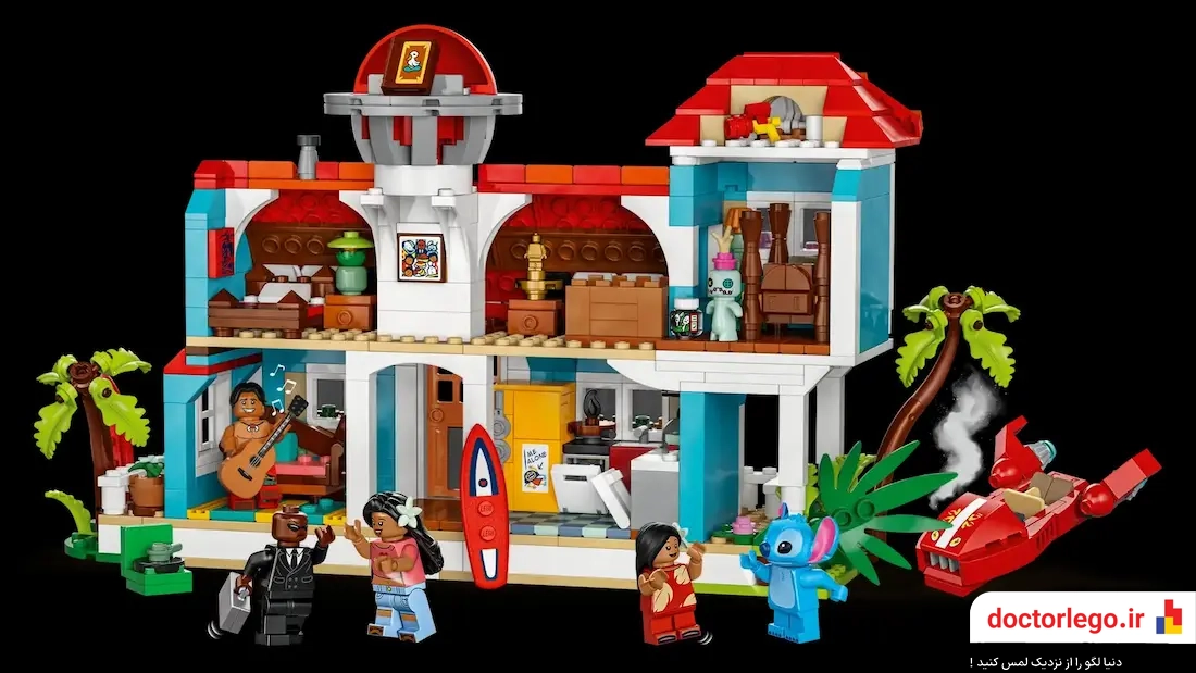 ویلای ساحلی این ست پر از جزئیات ریز و دلنشینه؛ از سقف شیروونی رنگارنگ گرفته تا تاب بزرگ زیر درخت نارگیل، از محوطه‌ی آفتاب‌گیر تا وسایل کلاسیکی که توی خونه هستن. لگو اینجا کاری کرده که حتی اگه انیمیشن رو ندیده باشی، با اولین نگاه عاشق فضای هاوایی بشی. و خب، حضور مینی‌فیگ‌های خاص لیلو و استیچ؟ بی‌نهایت دوست‌داشتنی و خاطره‌انگیز.