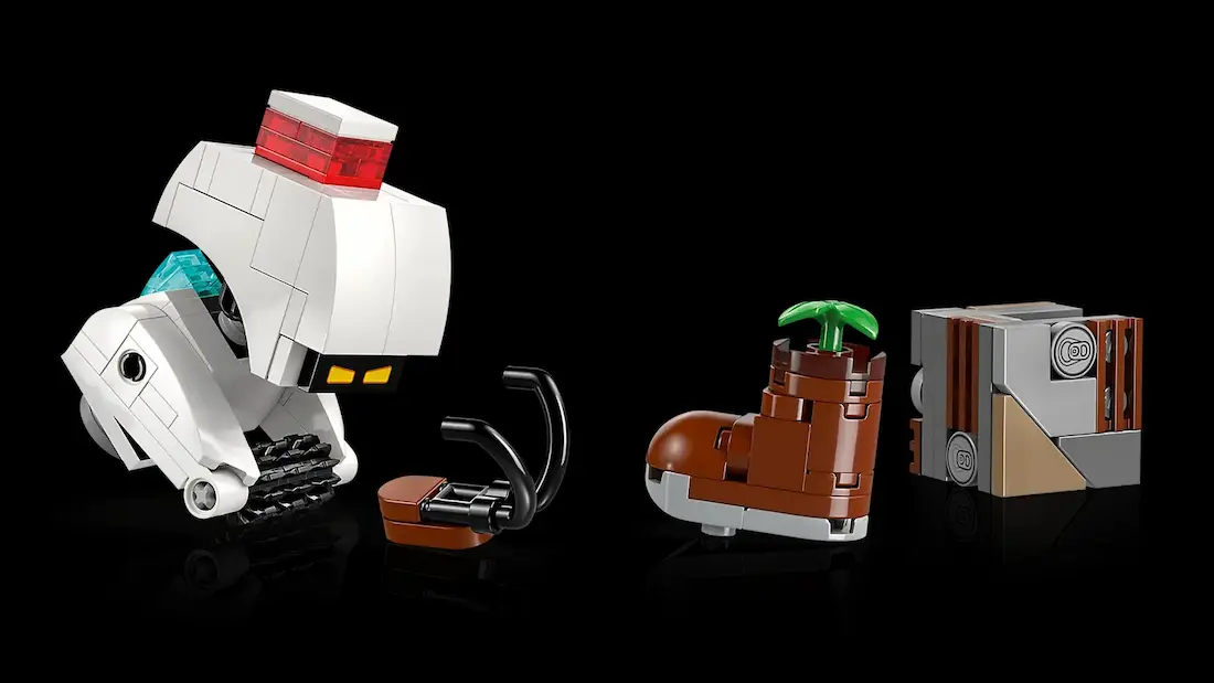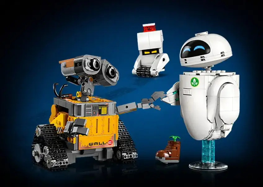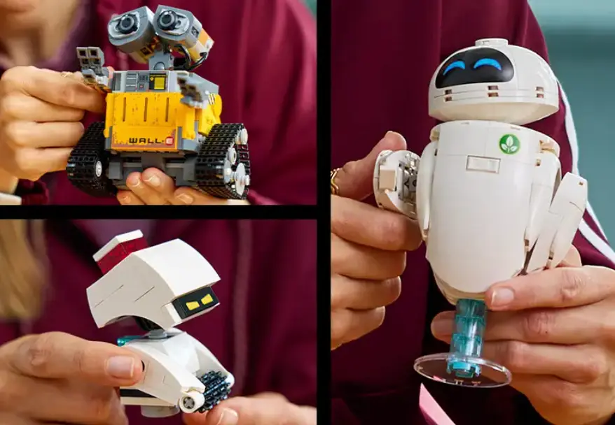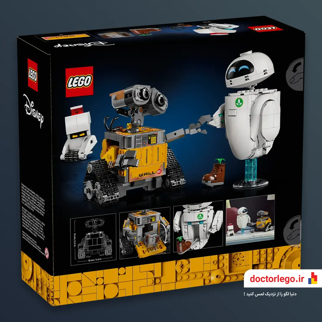 ست لگو شامل دو مدل جداگانهست — WALL•E با جزئیات دقیق، گردن متحرک، دستهای مفصلدار و جای مخصوص نگهداری گل.