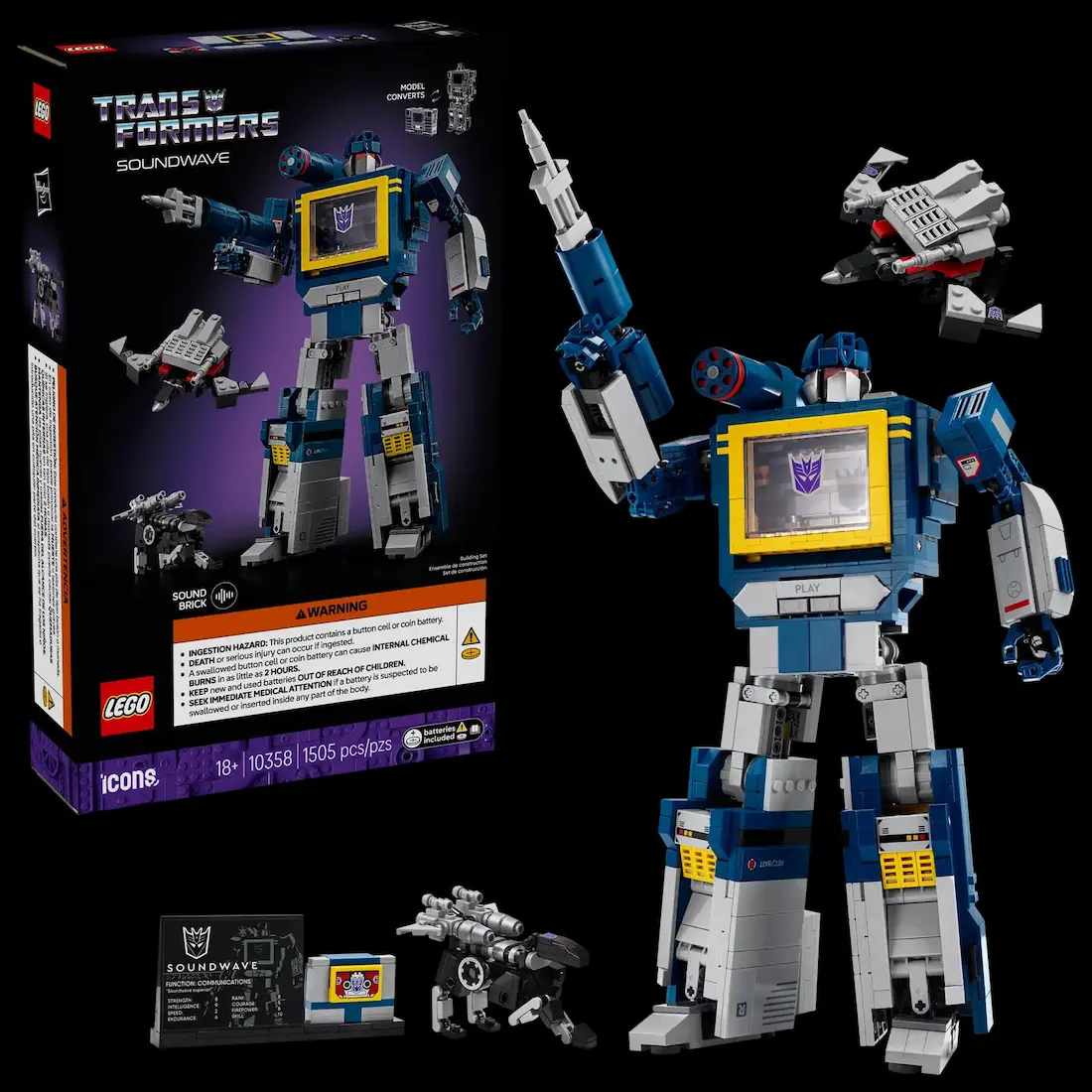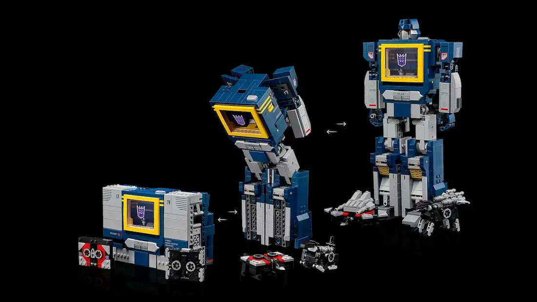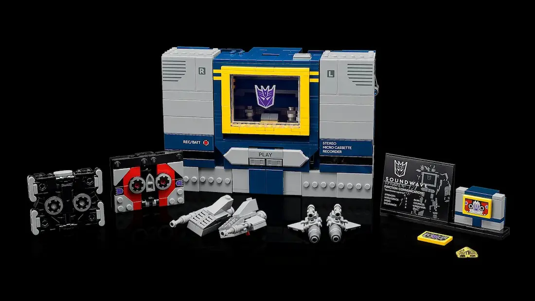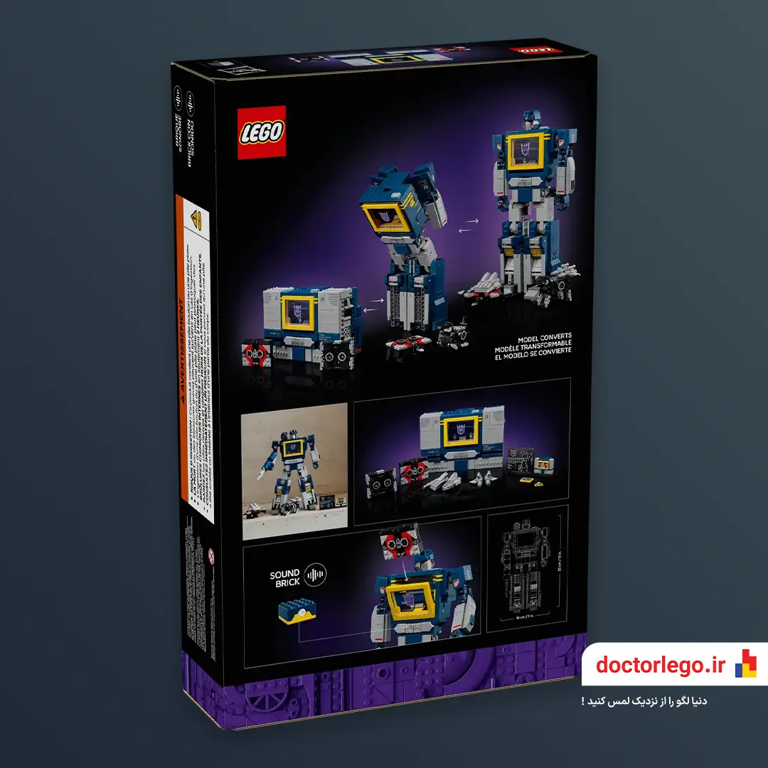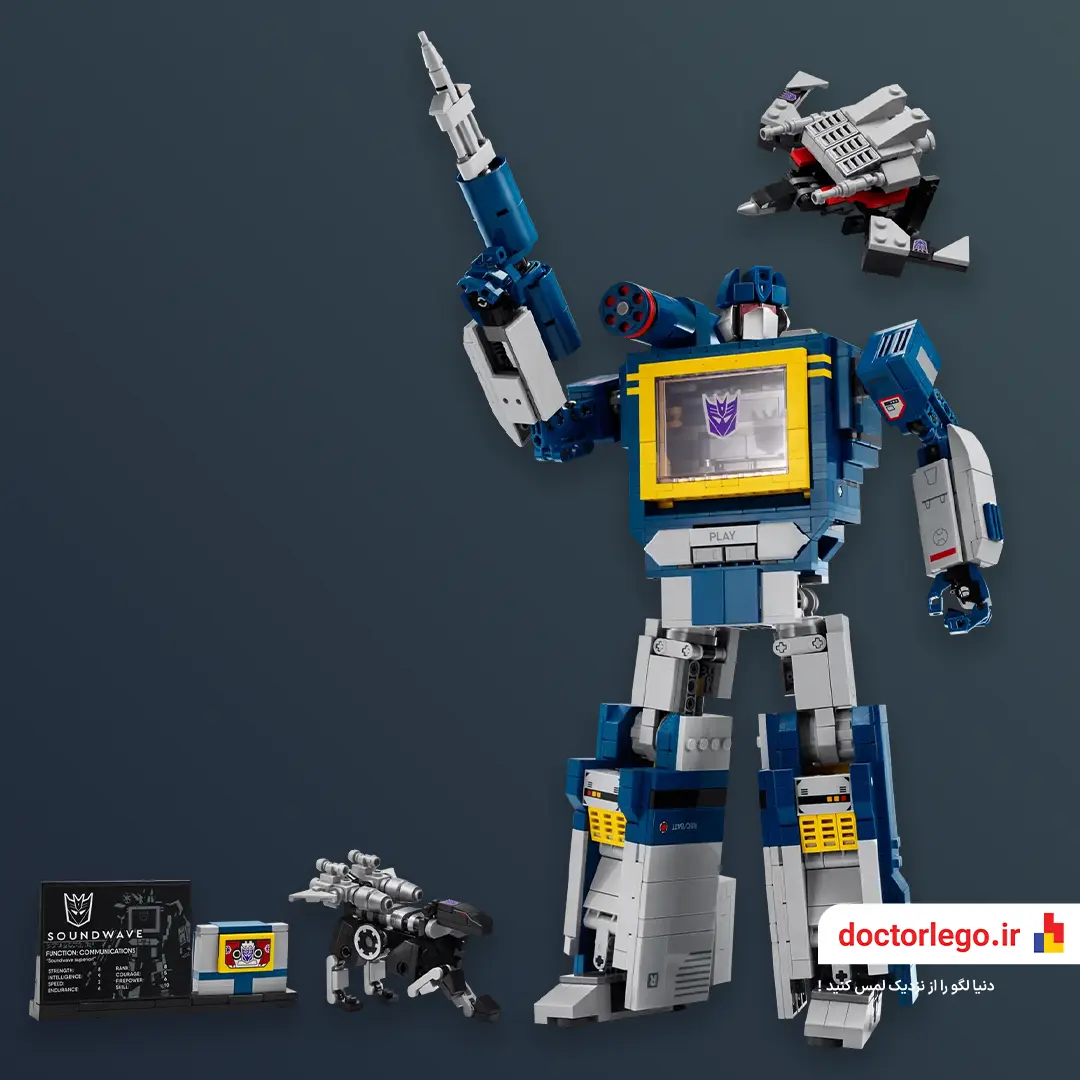 تو این مدل از سری آیکونهای لِگو، ساوندویو با همون طراحی کلاسیک دهه ۸۰ ساخته میشه. بدنه آبی و نقرهای، نوار کاست جلوی سینه، دکمههای کوچیک روی شونه و یه اسلحهی آشنا روی بازوش. حتی نوارهای کاست معروفش هم همراهشن: لیزربیک، رَوِنج، و باسسا، که خودشون هم به مدلهای کوچیک قابل ساخت تبدیل میشن!