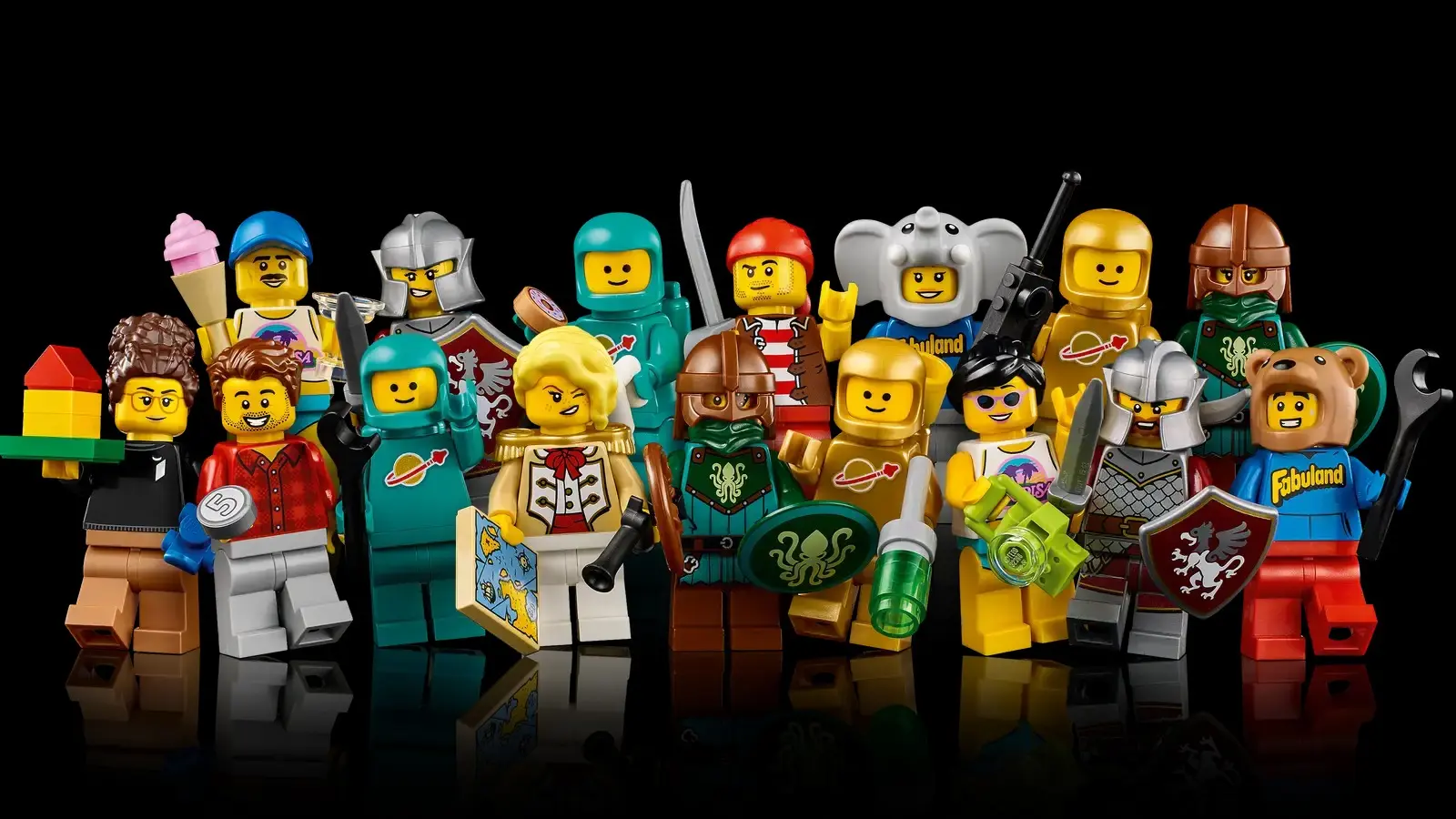 ۲. مینیفیگورهای نوستالژیک و خاص: 16 عدد مینیفیگور با محوریت تمهایی مانند Classic Space، Castle (Griffin & Kraken)، Paradisa، Fabuland، Pirates و حتی نسخههای ویژه از طراح خودش!