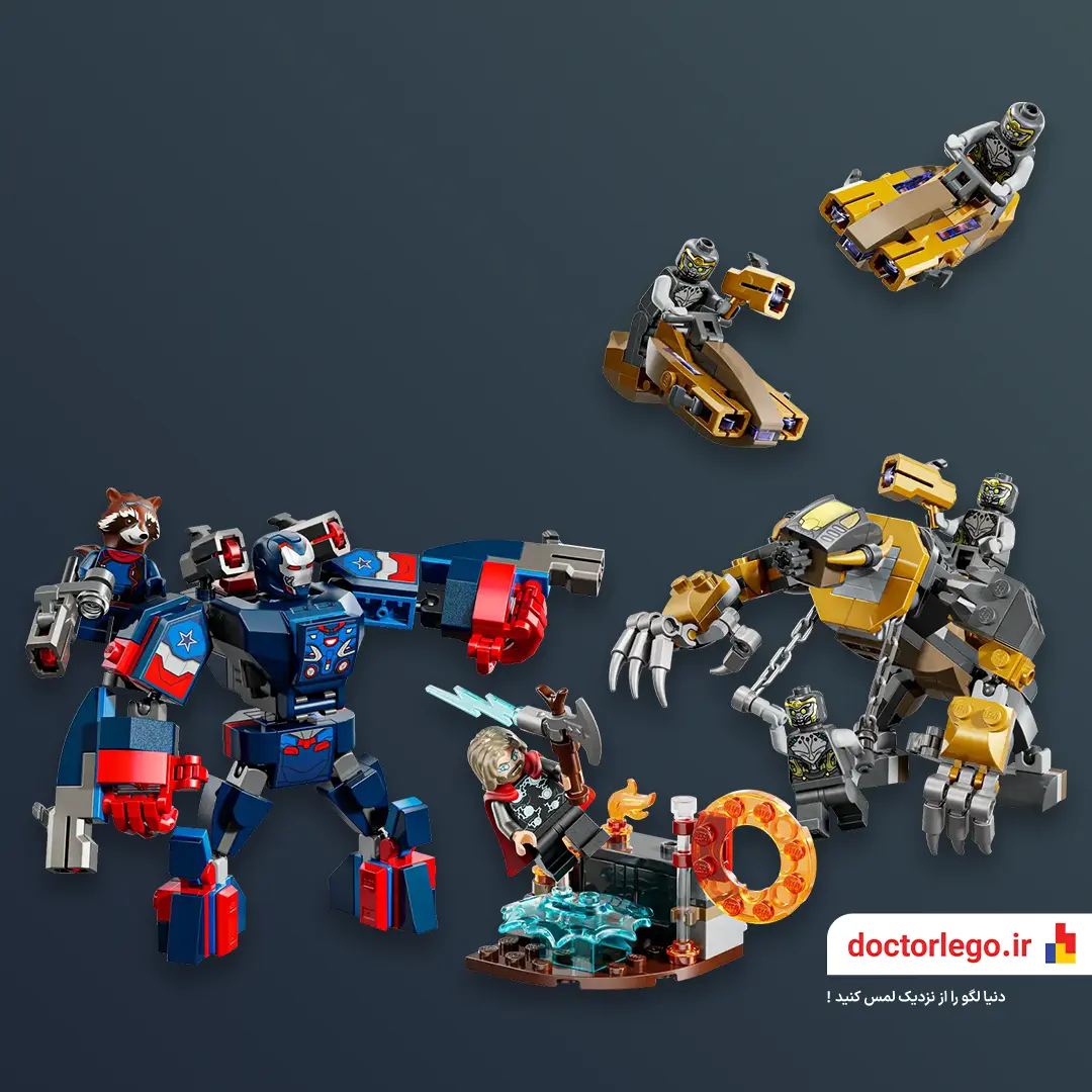 ثور با تبر افسانهای خود، استورمبریکر، آمادهی رویارویی با دشمن است. مینیفیگور او با جزئیاتی دقیق طراحی شده؛ از زره درخشان تا شنل قرمز نمادین که جلوهای اصیل و کلکسیونی دارد. در مقابل، سرباز چیتائوری با هاورکرافت فضاییاش وارد میدان میشود و یک دوئل هیجانانگیز آغاز میگردد.