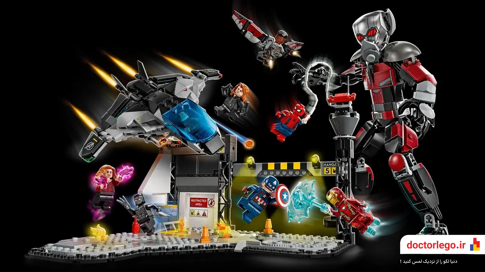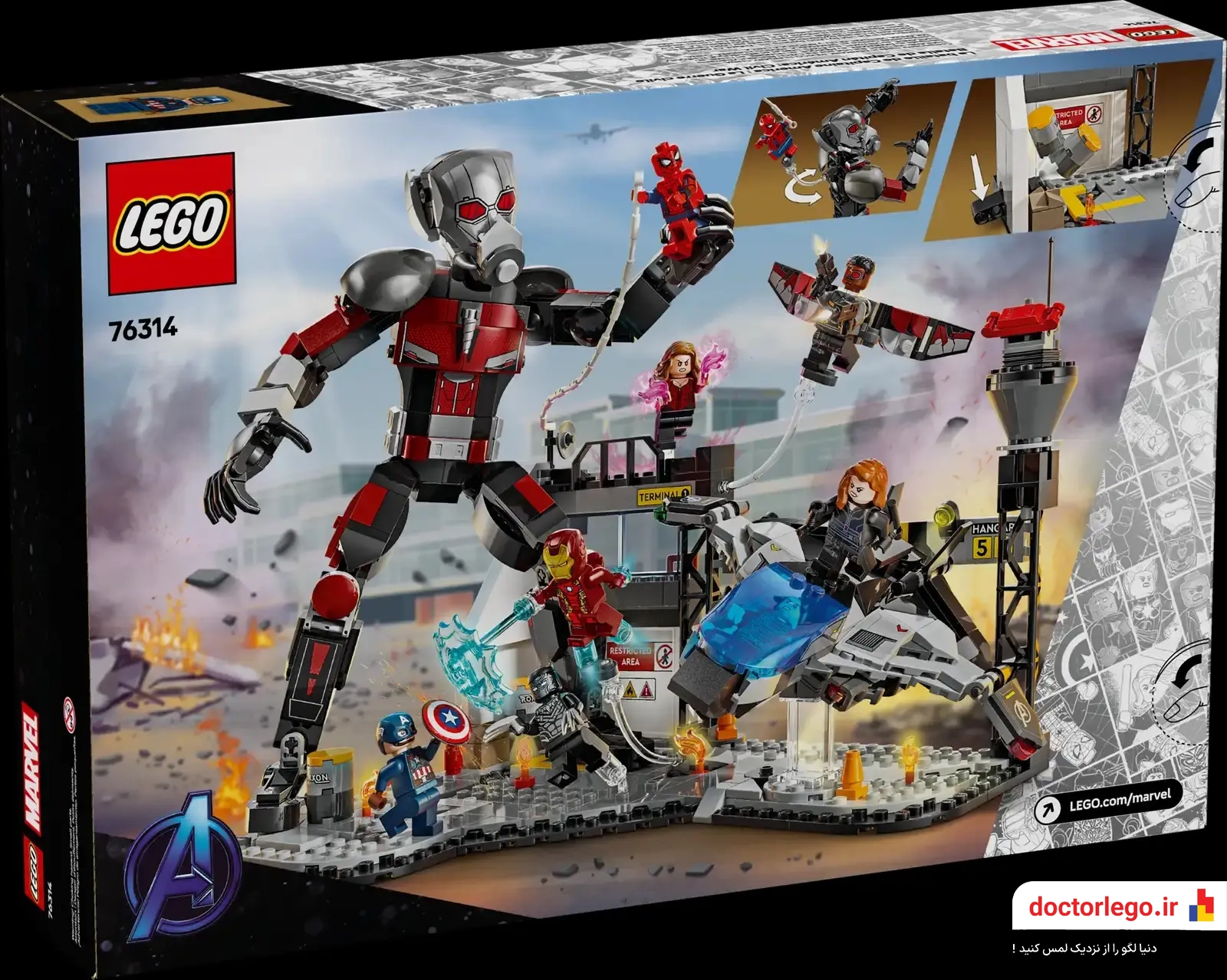 • شامل مینیفیگورهای کاپیتان آمریکا، مرد آهنی و بلک پنتر